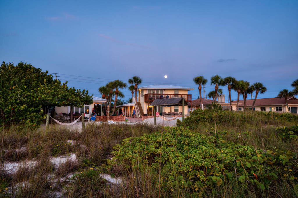 A sunset view of Suntan Terrace from the beach showcasing the rising moon